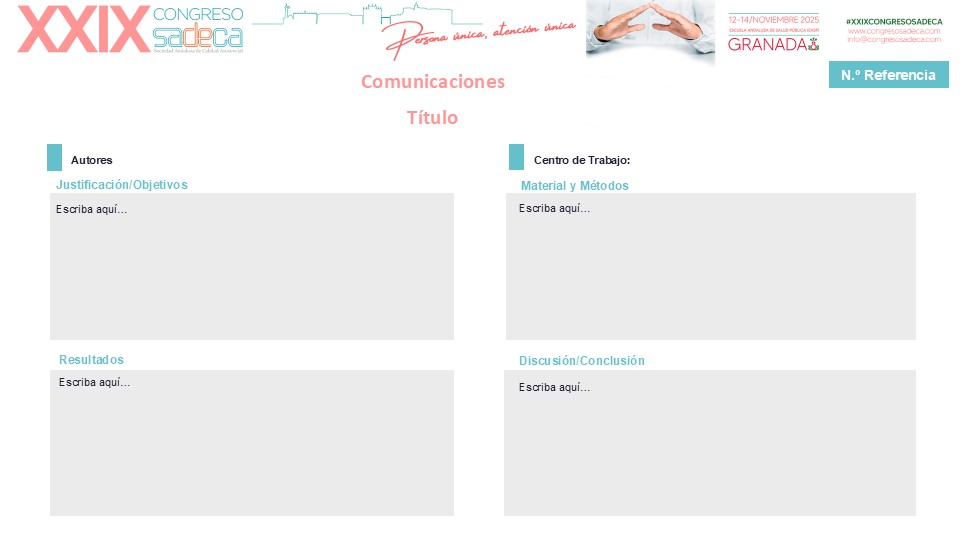 La organización del congreso ha puesto a su disposición una serie de plantillas en formato Power Point (vertical) con el fin de que elabore su póster en base a dichas plantillas de uso OBLIGATORIO. Les recordamos que la comunicación debe tener los mismos contenidos referidos en el resumen y la estructura que figure en la normativa. No obstante, queda permitido variar la composición de la plantilla, así como la inclusión de gráficos, figuras, fotografías, etc.